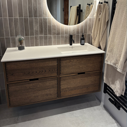 Dette snedker badmøbel har 4 skuffer og vasken er placeret i venstre side. Badmøblet er fremstillet med massive, olierede og fingertappede træskuffer i egetræ med flotte detaljer. Skufferne er lavet med fuldudtræk samt softluk og kommer med vaskeudskæring i øverste skuffe og fuld dybde i den nederste skuffe.