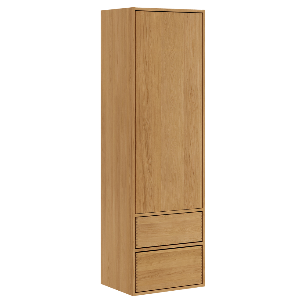 Snedker bad højskabet er designet med 2 dybe massive, olierede fingertappede egetræs skuffer og en låge, som du kan vælge at have enten højre- eller venstrevendt hængsler på.