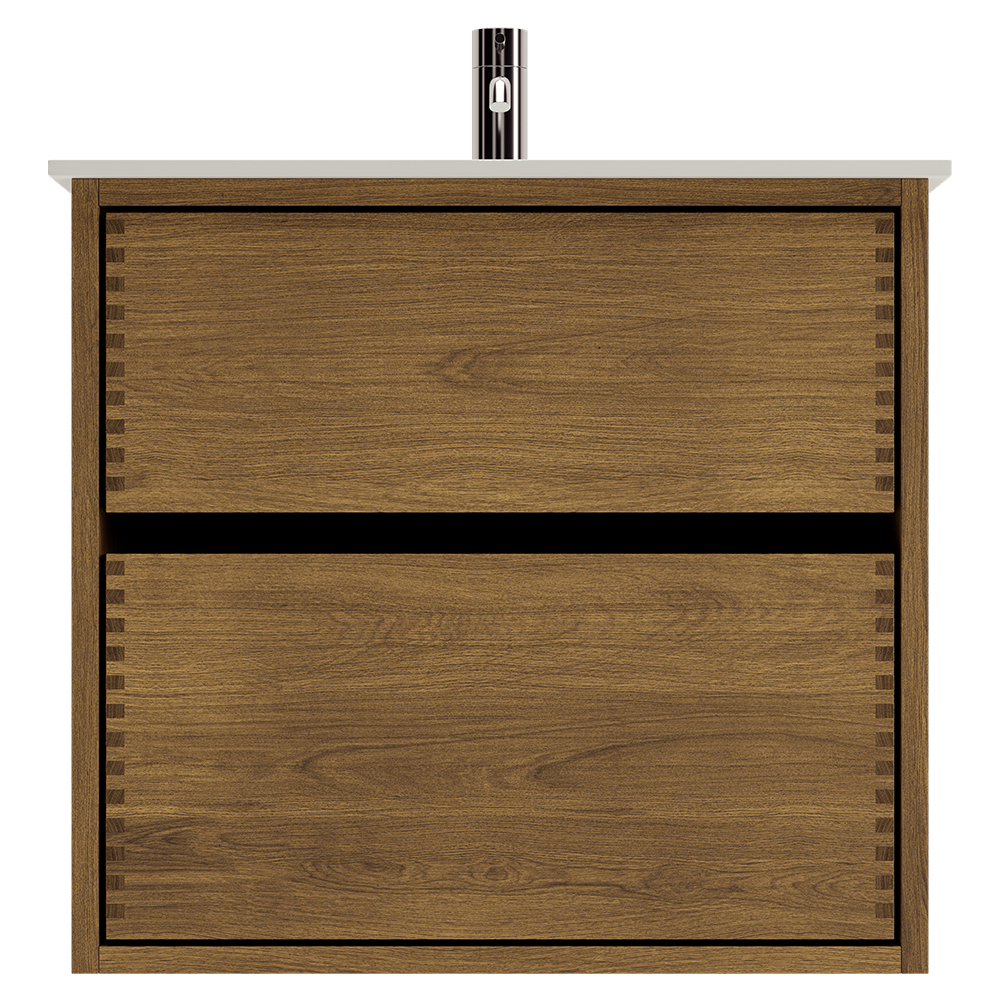Dette snedker badmøbel har 2 skuffer. Badmøblet er fremstillet med massive, olierede og fingertappede træskuffer i egetræ med flotte detaljer. Skufferne er lavet med fuldudtræk samt softluk og kommer med vaskeudskæring i øverste skuffe og fuld dybde i den nederste skuffe.
