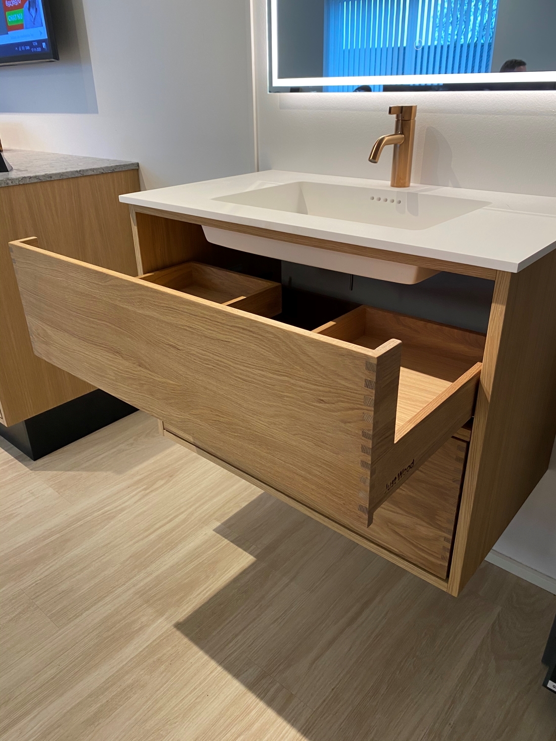 Dette snedker badmøbel har 2 skuffer. Badmøblet er fremstillet med massive, olierede og fingertappede træskuffer i egetræ med flotte detaljer. Skufferne er lavet med fuldudtræk samt softluk og kommer med vaskeudskæring i øverste skuffe og fuld dybde i den nederste skuffe.