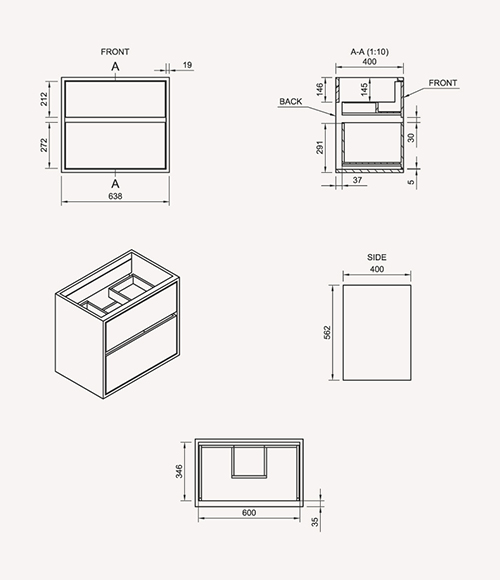 Dette snedker badmøbel i reduceret dybde har to skuffer. Badmøblet er fremstillet med massive, olierede og fingertappede træskuffer i egetræ med flotte detaljer. Skufferne er lavet med fuldudtræk samt softluk og kommer med vaskeudskæring i øverste skuffe i midten og fuld dybde i den nederste skuffe.