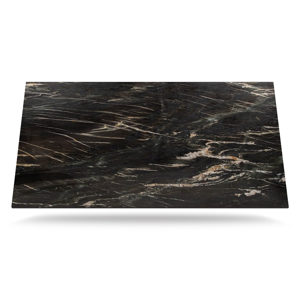 Belvedere er en quartzite bordplade i sort og mørkegrå med synlig årestruktur i hvid og guld, der minder om marmor. Belvedere er tilgængelig i en tykkelse på 20 mm og med mulighed for at få tilføjet både vask og kogeplade.