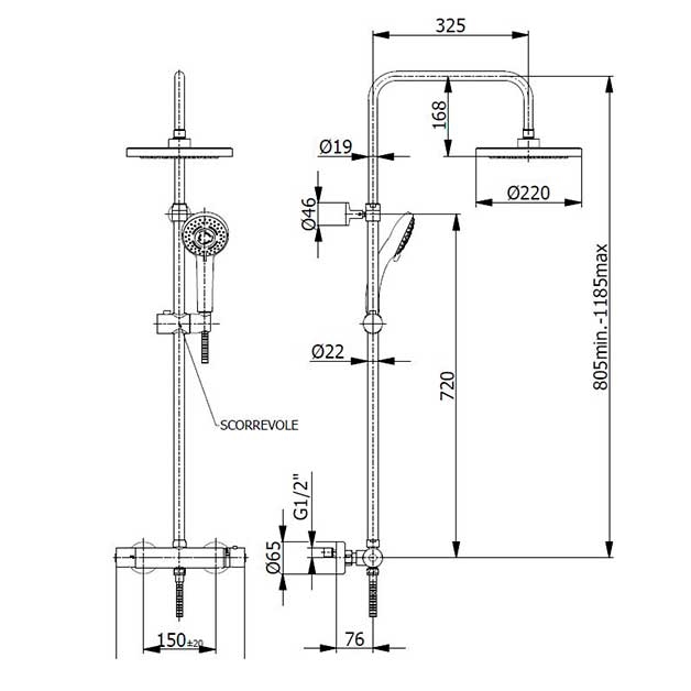 Komplet brusesæt m. termostat, brusehoved og højdejusterbar håndbruser m. 5 stråletyper.