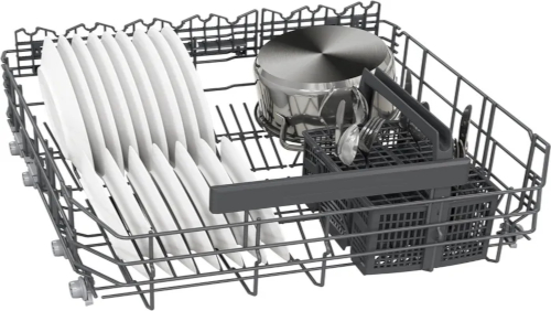 varioDrawer-topkurv giver dig et ekstra niveau i opvaskemaskinen. Med den specielle form giver den ikke bare plads til bestik, men også til grydeskeer, salatbestik og mindre servicedele, som f.eks. espressokopper. Og da det ikke længere er nødvendigt med en bestikkurv i underkurven, er der nu plads til service til 14 personer.