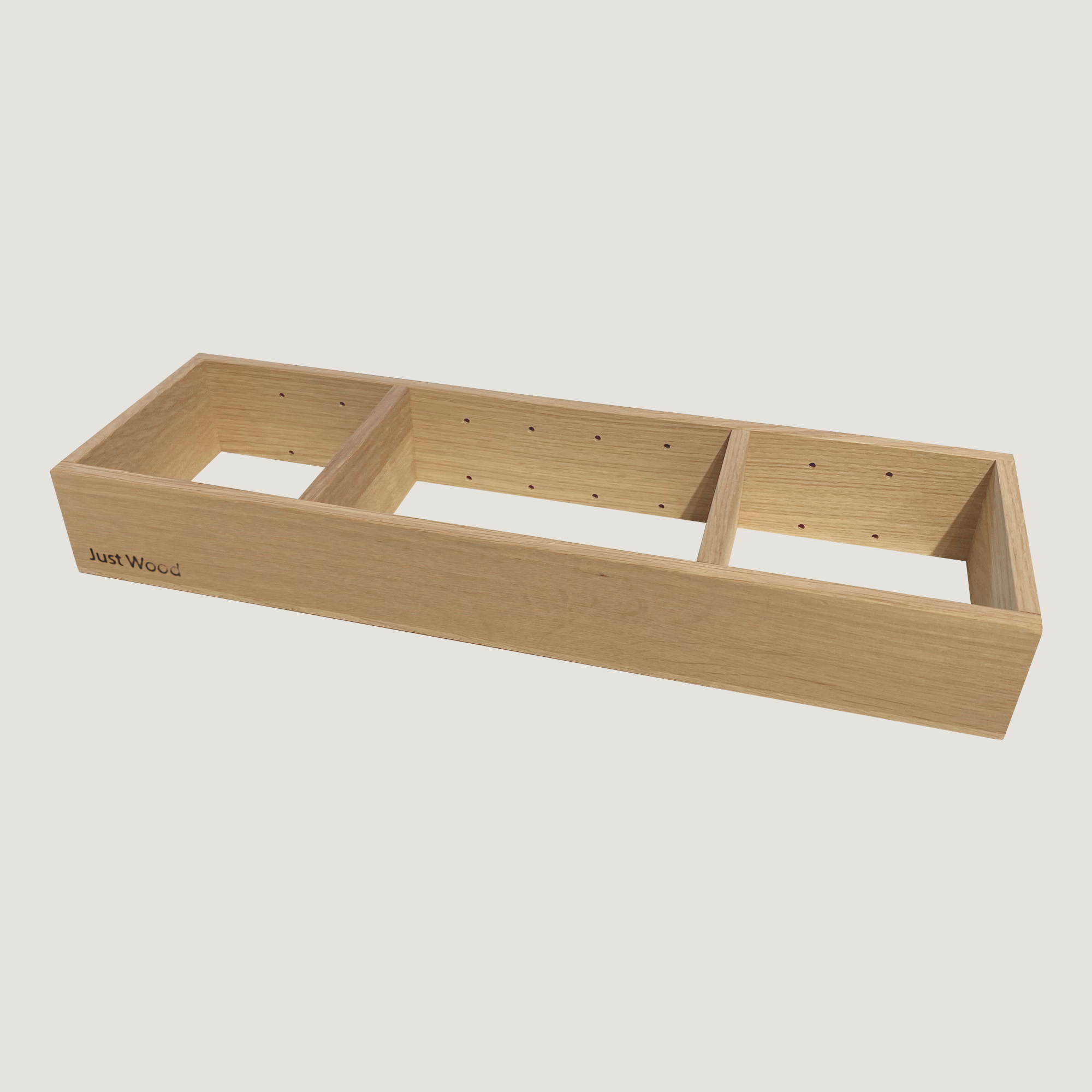 Just Wood skuffeinddeler i massivt, olieret egetræ er en elegant og funktionel løsning, der fuldender dit Just Wood badmøbel. Skuffeinddeleren passer i alle Just Wood badskuffer og er særligt tilpasset skuffen under vasken med udskæring til afløb. Bemærk, at den ikke passer til bad højskabe.
