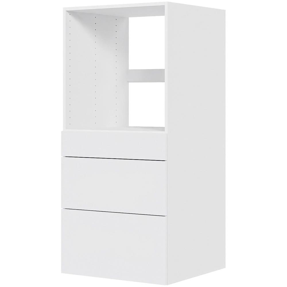 Et praktiske indbygningsskab med plads til ovn, du får mange funktioner i et skab. Dette skab har 3 stk. kvalitetsskuffer, der bærer op til 40 kg. pr. skuffe. Alle skufferne har en dybde på 50 cm, og der er deludtræk og softluk på skufferne og leveres usamlet.